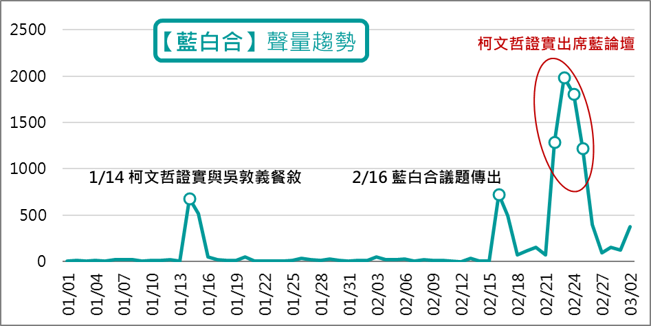 據(jù)《山水民調(diào)X輿情觀測》聲量趨勢資料可知,農(nóng)曆年前,藍白合議題討論較為零星,直到2/22,無預警傳出柯文哲將出席國民黨智庫所舉辦的「願景臺灣2030」論壇,相關(guān)討論瞬間暴增,四天內(nèi)迅速累積6,303則討論篇數(shù),也成為當週政壇最熱門的議題之一。